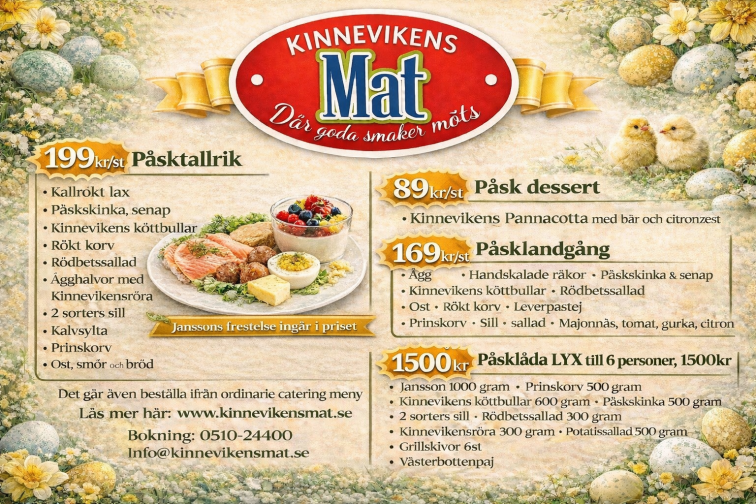 Boka redan idag: 0510-24400 eller info@kinnevikensmat.se