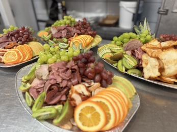 En vackert upplagd planka med 3 sorters svenskt kött eller fågel (ca 160 g/port) samt frukter efter säsong som tex vindruvor, apelsin, passionsfrukt, kiwi, melon och ananas.