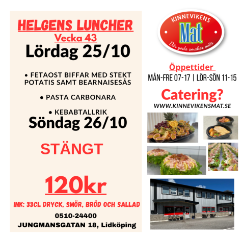 Varm lunch för avhämtning. Måndag-Söndag 11:00-15:00